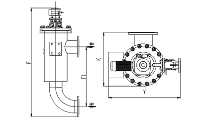 | 型號 | 管徑 | 出入水口 | F | Y | K | 濾網(wǎng)面積 | 處理水量 | 重量 |